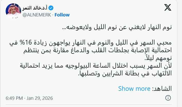وقال النمر عبر حسابه على منصة «إكس»: إن نوم النهار لا يُغني عن نوم الليل ولا يُعوّضه، مشيرًا إلى أن محبي السهر ليلًا والنوم نهارًا يواجهون زيادة بنسبة 16% في احتمالية الإصابة بجلطات القلب والدماغ، مقارنة بمن ينتظم نومهم ليلًا؛ لأن السهر يسبب اختلال الساعة البيولوجية، ما يزيد من احتمالية الالتهاب في بطانة الشرايين وتصلبها.